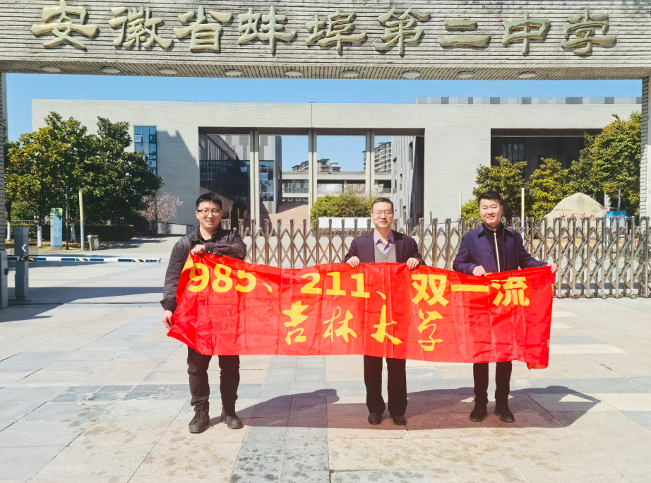 第二组于3月18日在蚌埠二中进行宣讲,学院新闻系主任严俊教授、校友工作办公室主任田鹏、学院本科生辅导员于航与蚌埠二中书记、教导主任、招生工作负责人进行座谈,就双方学校具体情况、学生情况进行交流。交流后学院将学校招生宣讲材料分发给学生,提高学生对于吉林大学的认识。