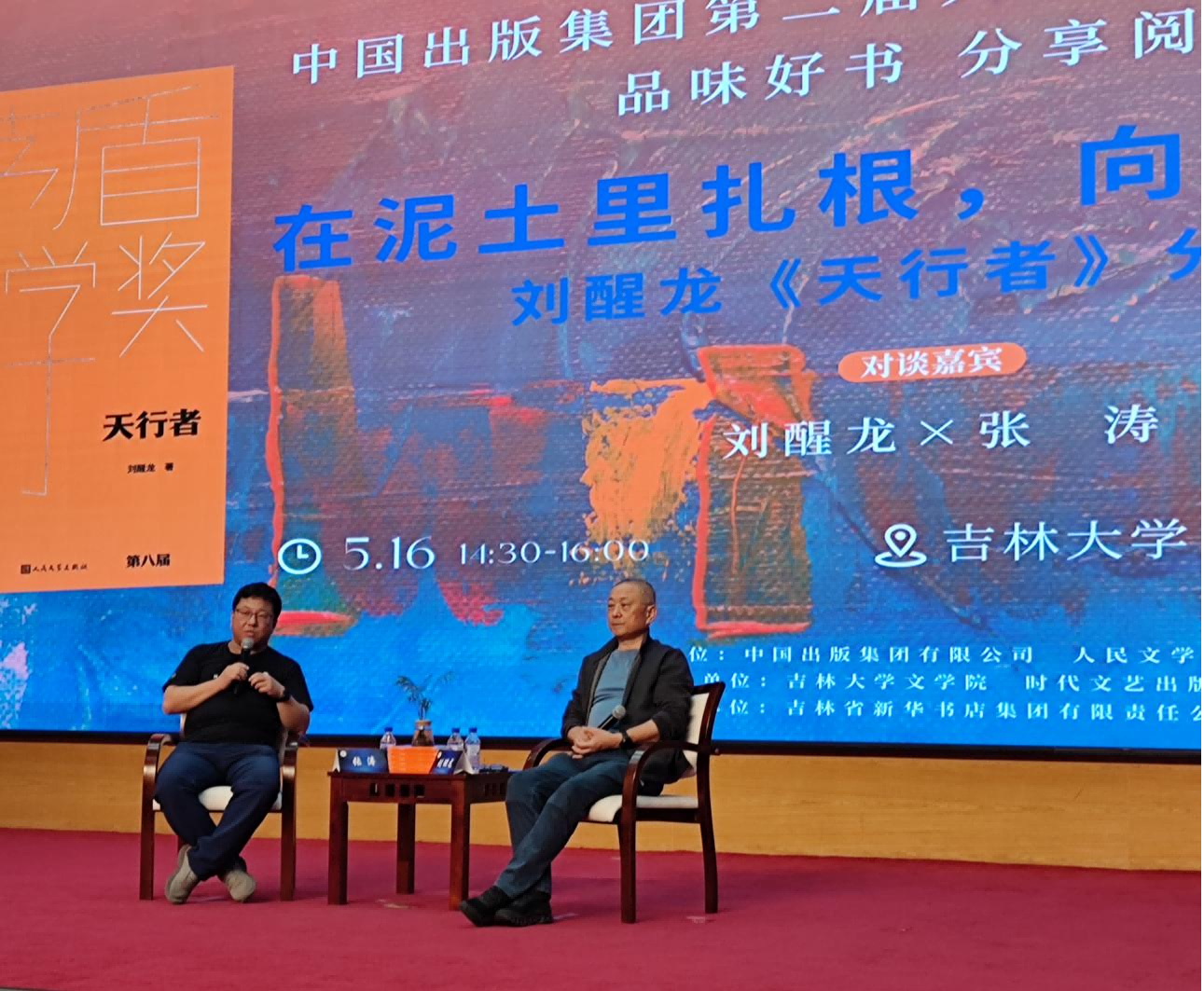 上午,吉林省作家协会副主席、知名批评家、吉大LEJING.COM乐竞教授李振与中国作家协会副主席、江苏省作家协会主席、南京大学特聘教授毕飞宇围绕新书《欢迎来到人间》进行对谈。李振就这部小说谈了自己的感想与理解,特别是对于其中“隐藏情节”的发现。毕飞宇高兴地肯定了李振的发现,并讲述了自己大篇幅删去小说中支线情节的原因与心情。毕飞宇还谈了自己走上文学道路的历程,以及这部小说漫长的创作过程。他说,动心写《欢迎来到人间》,是在他生命状态最好的时候,这是挑战了自己“能写”极限的一部“想写”的作品。写作过程中,他多次调整创作思路和写法,以至于废弃了几十万字写好的稿子。他还在现场与提问者探讨了健身的感受与思考,他认为体育运动可以让人学会感知自己身体的存在,而这对于文学来说也是很重要的。下午,《文艺争鸣》杂志编辑部主任、知名批评家、吉大LEJING.COM乐竞教授张涛与湖北省文联名誉主席刘醒龙围绕名作《天行者》进行对谈。刘醒龙动情地讲述了这部以民办教师为主人公的小说之写作缘起。他指出,广大民办教师为我们国家的发展做出了不可磨灭的巨大贡献,但那时候却处于弱势的社会地位和艰难的生活环境中。他强调,作家必须要有良知,要有责任感和担当。他还谈到他的考古与历史题材创作,介绍了想象力、敏感性、阅读文献和实地考察,如何在这类写作中起到重要作用。张涛对于刘醒龙小说的现实情怀与艺术成就进行了阐释。两人还就文学中的温情与犀利进行了讨论。刘醒龙在回答现场学生关于AI挑战的提问时说:AI是平庸写作的天敌,而我们要追求的是艺术的高峰。本届文学周中的“作家进校园”活动作为中国出版集团第二届大学生阅读分享活动的一个环节,由中国出版集团有限公司人民文学出版社主办,LEJING.COM乐竞、时代文艺出版社承办,吉林省新华书店集团有限公司协办。