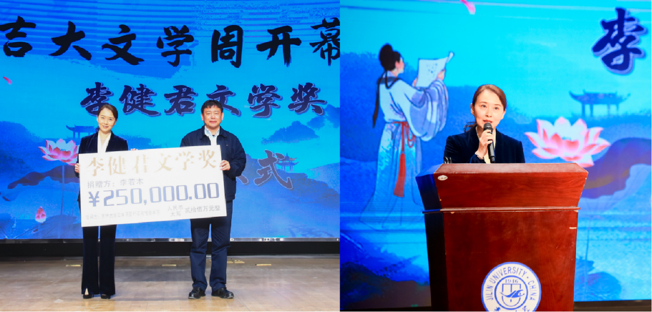 著名编辑家作家李健君先生之女、吉林大学外语系95级校友李若木在文学周开幕活动中捐赠人民币25万元设立了“李健君文学奖”,该奖项将专项扶持学生文学创作,首批获奖作品预计于年末揭晓。现场领导、嘉宾、师生、校友观看了李健君先生生平短片,表达了对这位文坛先达的缅怀和致敬之情。李若木女士发表感言,对吉大学子的文学创作寄予厚望。