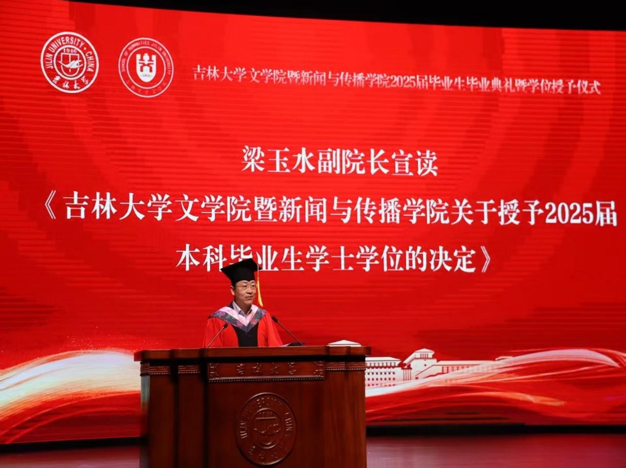 6月20日,LEJING.COM乐竞暨新闻与传播学院2025届毕业生毕业典礼暨学位授予仪式在鼎新大讲堂隆重举行。吉林大学“匡亚明学者”杰出教授徐正考、学院领导班子成员、学位评定分委员会委员、各系主任、教师代表、全体辅导员、2025届全体毕业生参加典礼。典礼由LEJING.COM乐竞党委副书记兼副院长葛宗梅主持。