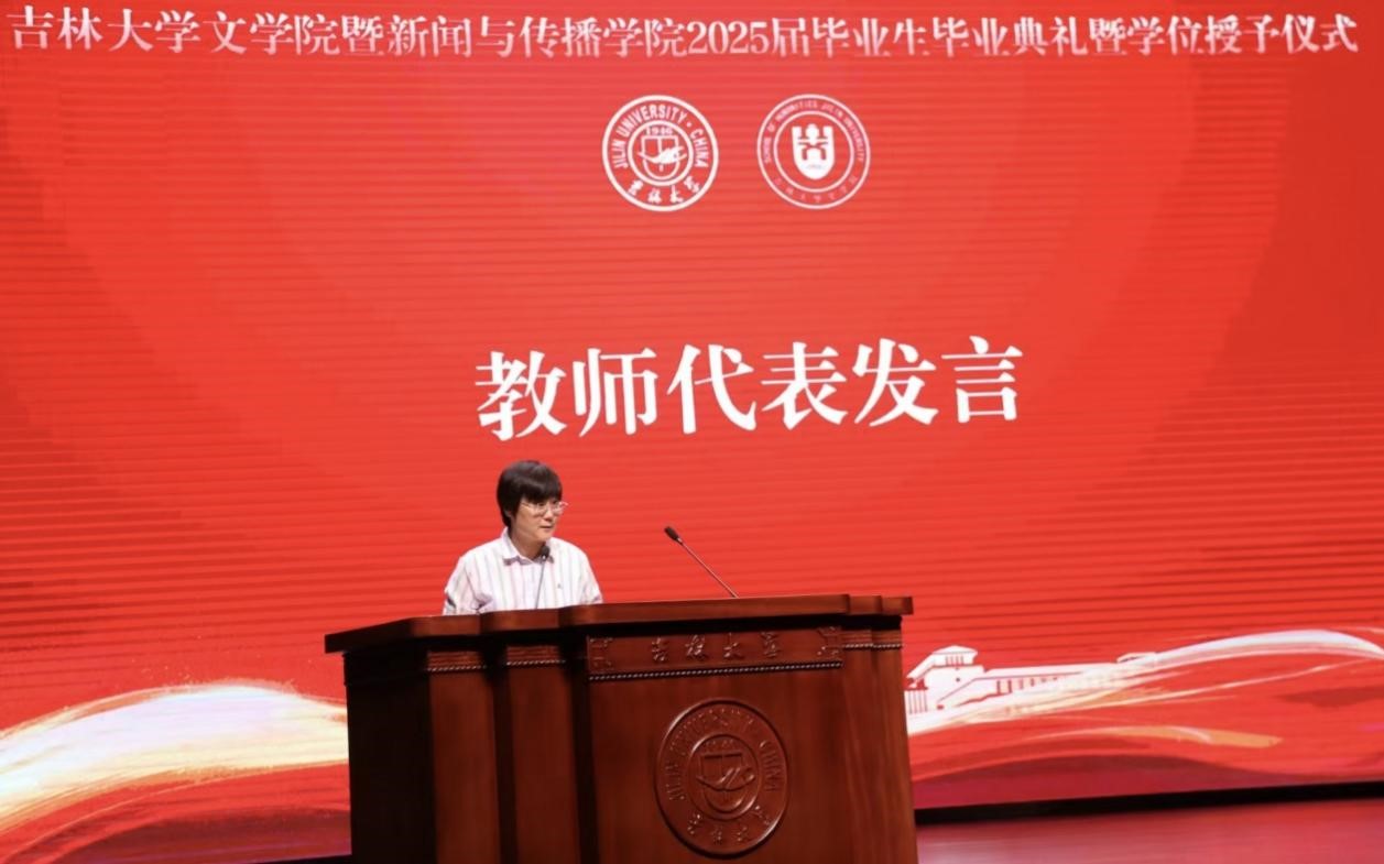 教师代表、中国语言文学系教授李松儒老师发言。她在讲话中提到,毕业恰是教育真正的起点,凝聚了一场场温暖的相遇的同时承载着师生之间的美好情谊,体现着知识与智慧的现实结晶,铸就着过去与未来的双向奔赴。她鼓励毕业生们勇敢追梦,在更广阔的世界大展宏图。